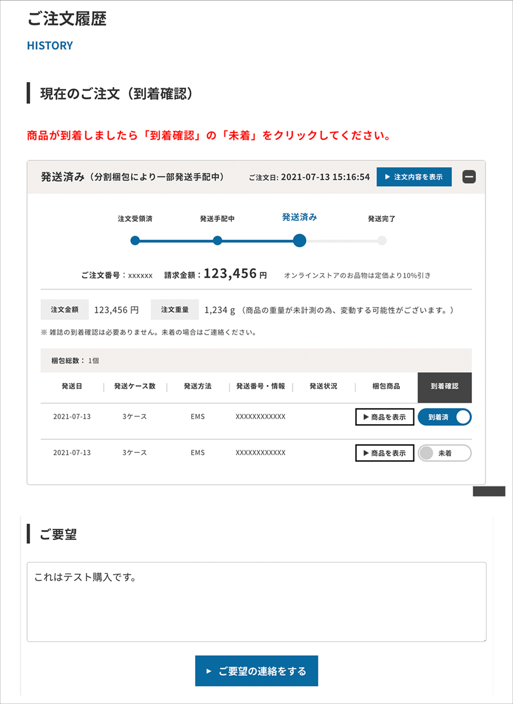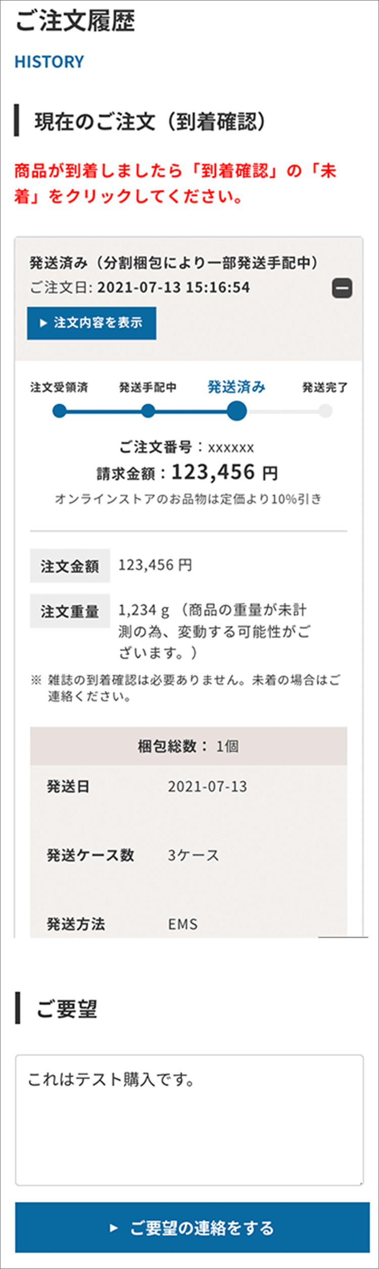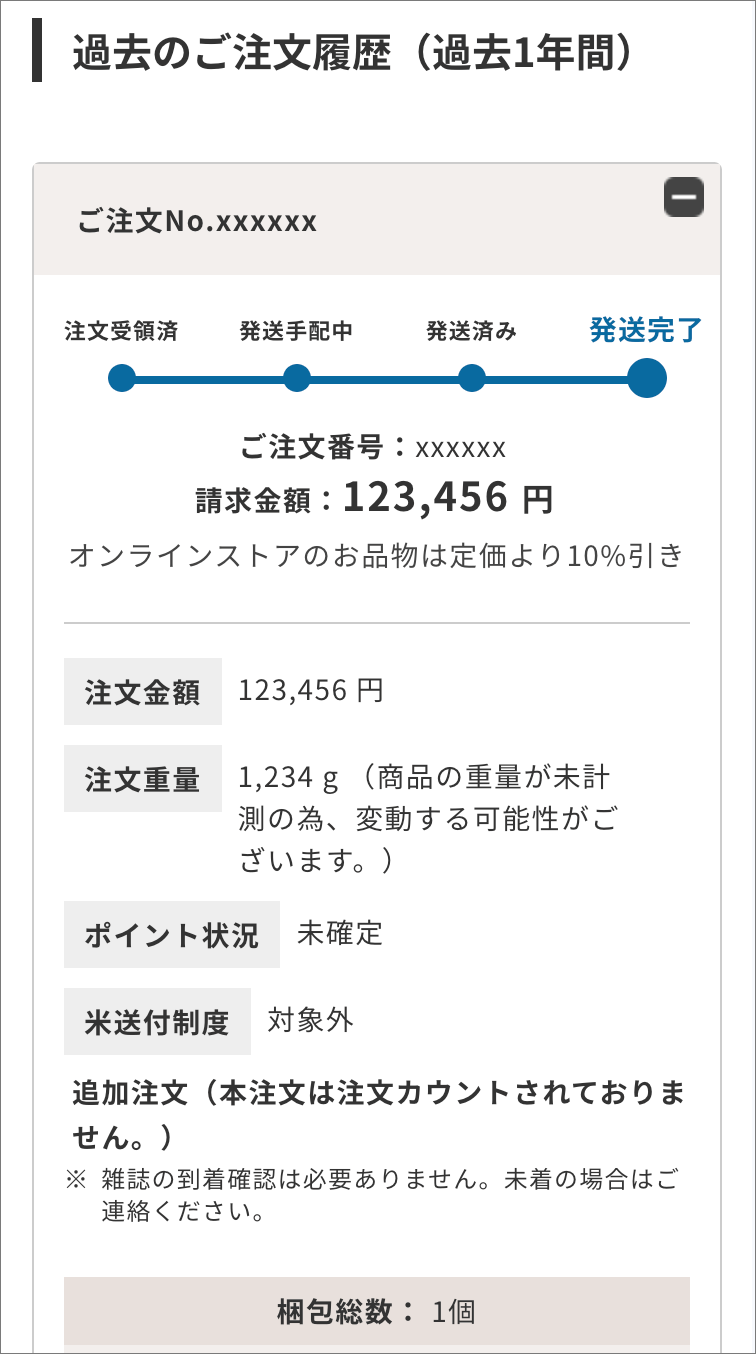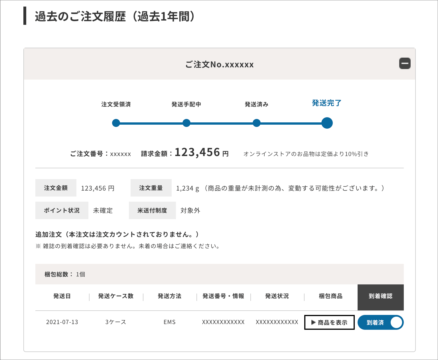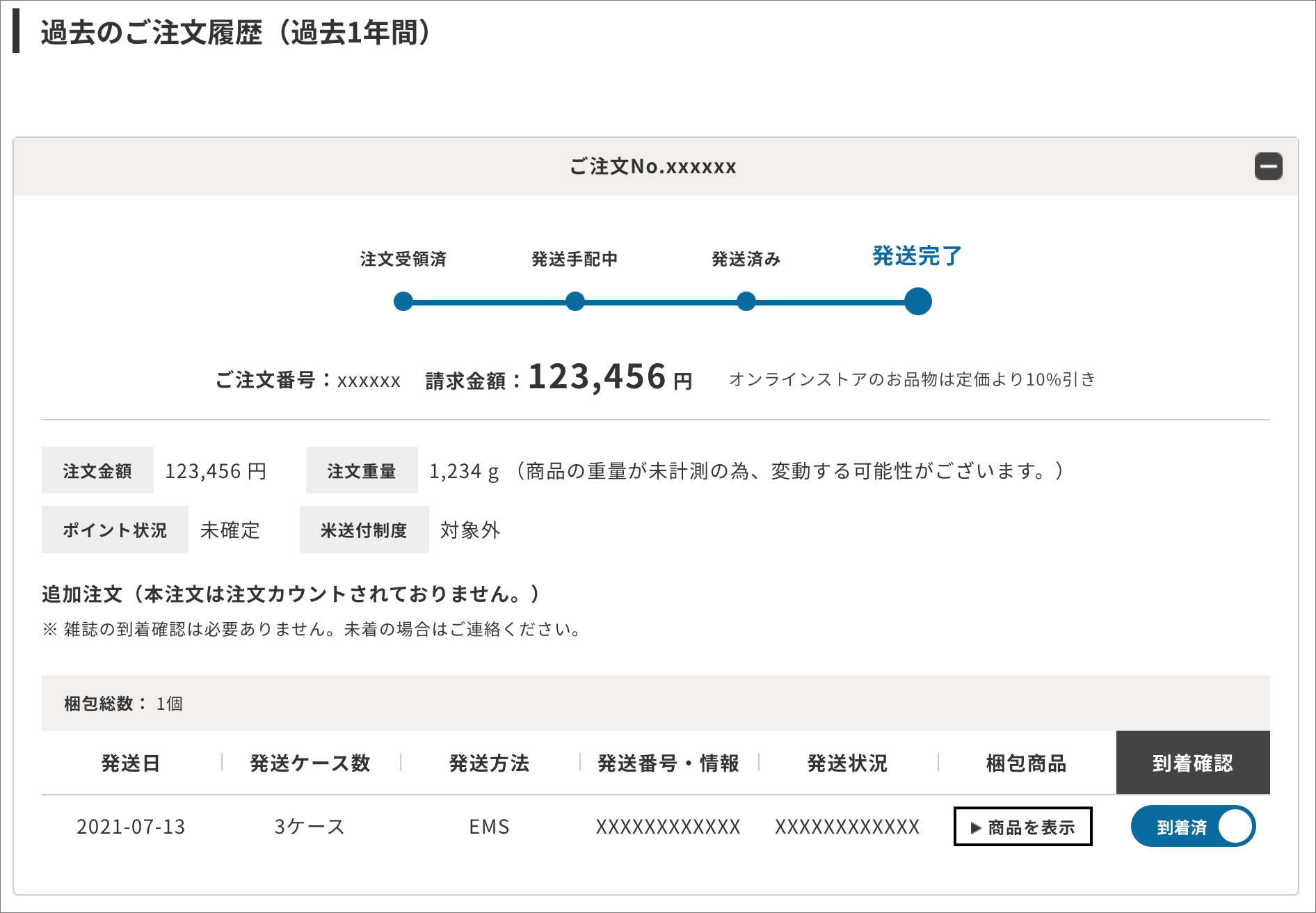過去のご注文履歴は、お客様から到着のご連絡をいただいた後(もしくはJESの発送完了から一定期間後)に反映されます。