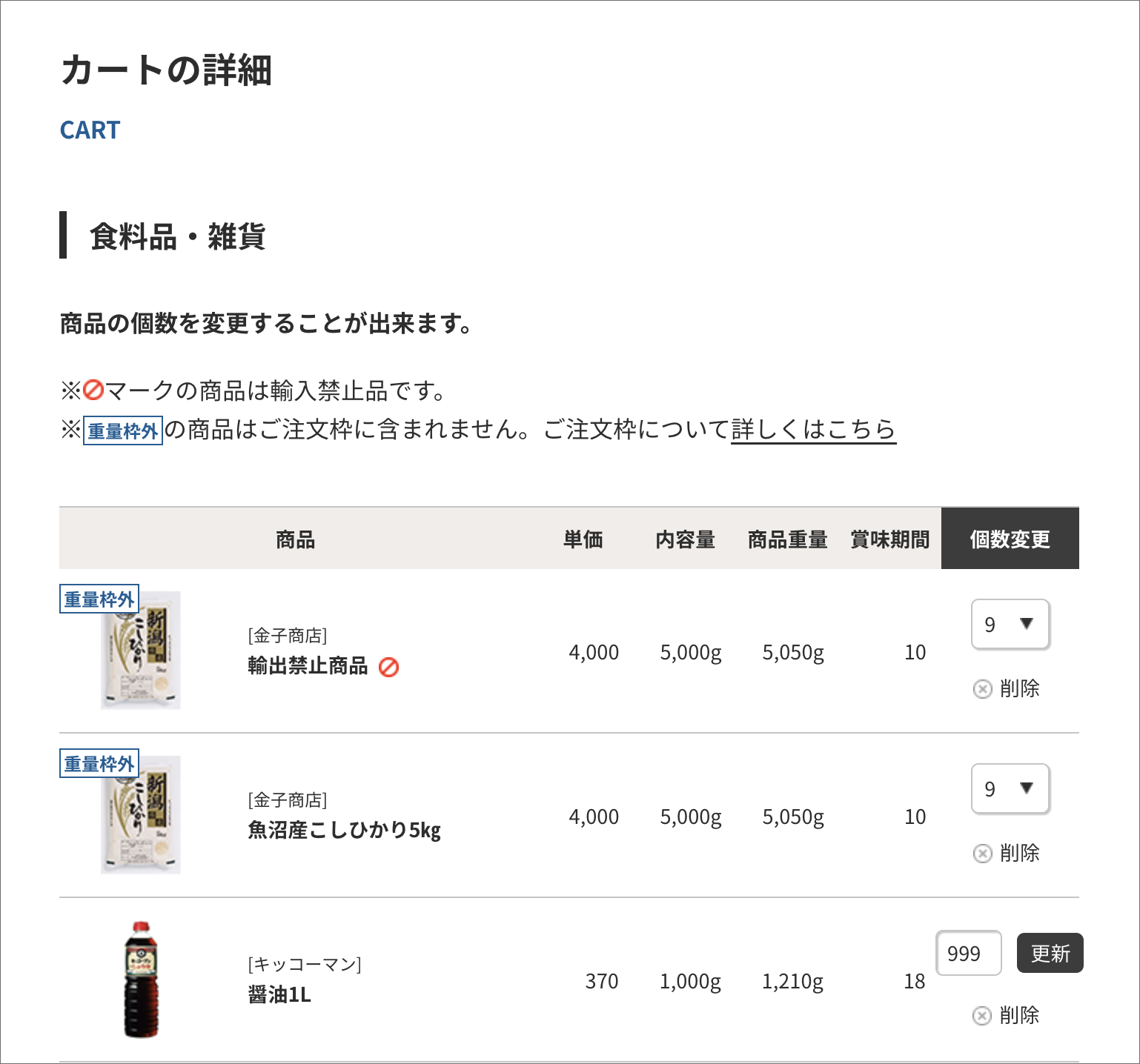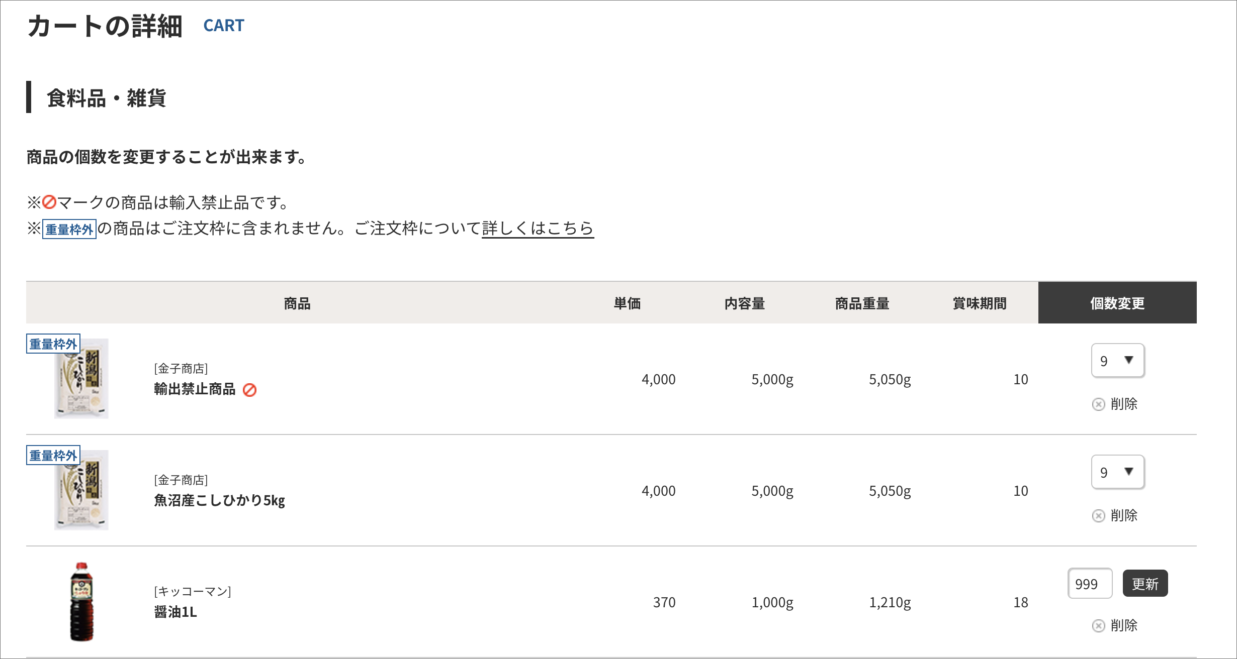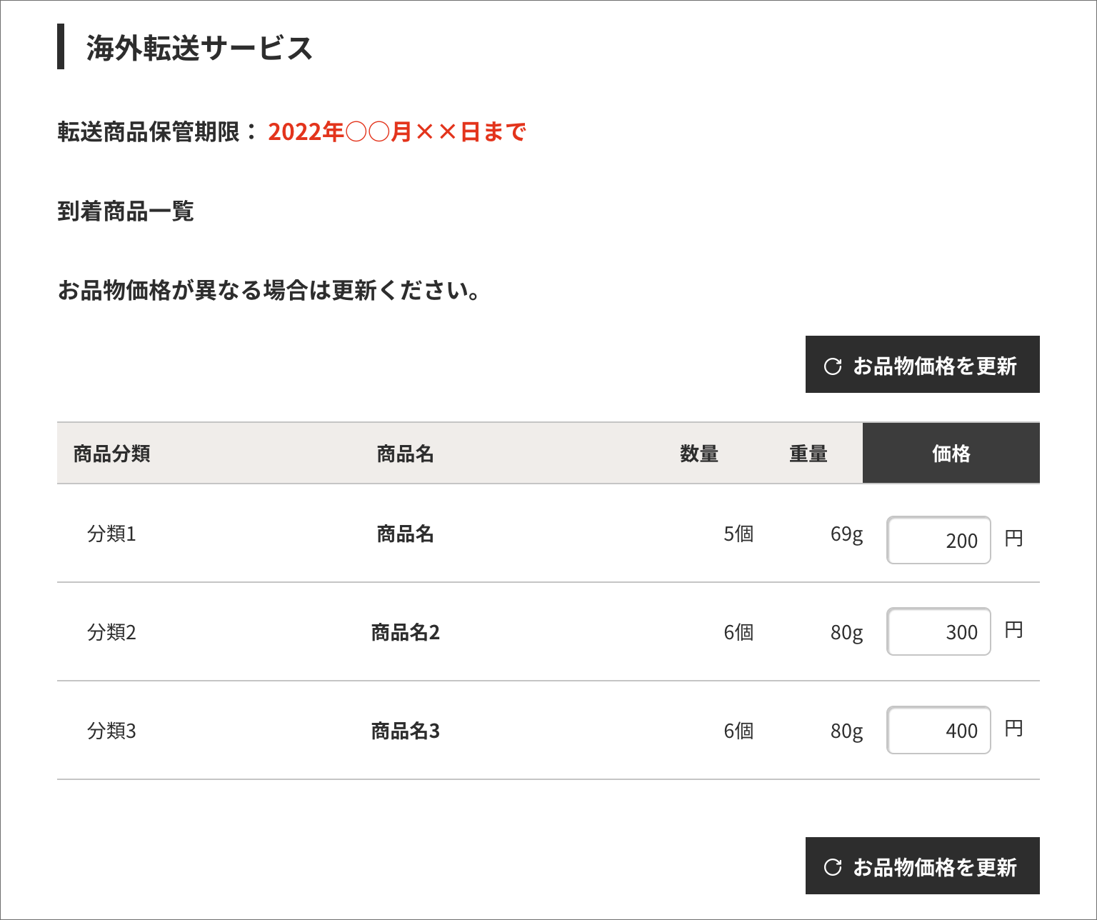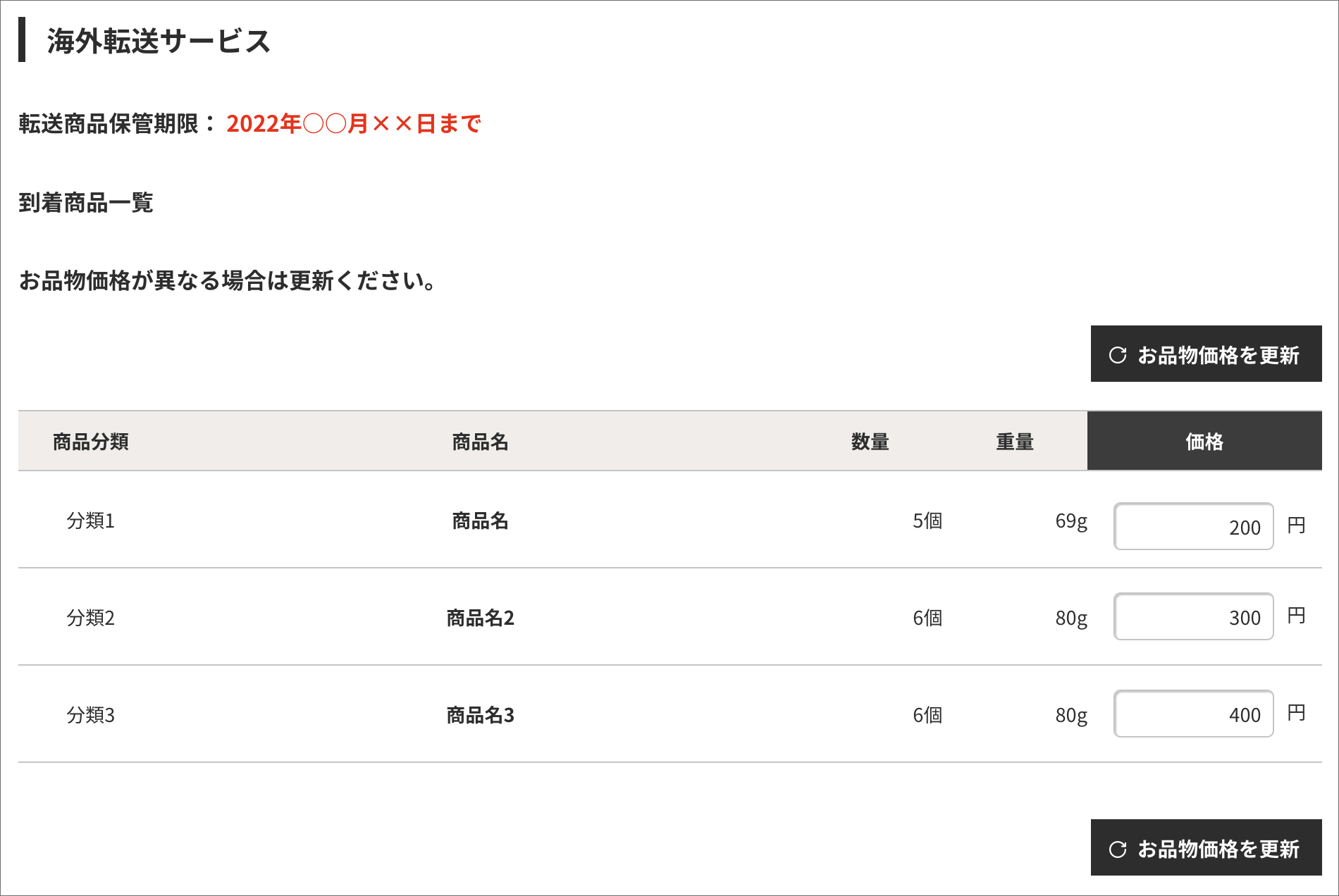 荷物到着後、カート内に商品が登録されます。商品内容をご確認いただき、お品物価格が異なる場合は更新ください。