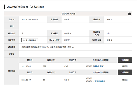 - 発送状況や各発送詳細(発送が複数回にわたった場合、それぞれの発送について)がご覧頂けます。未確定の場合は空欄になっています。