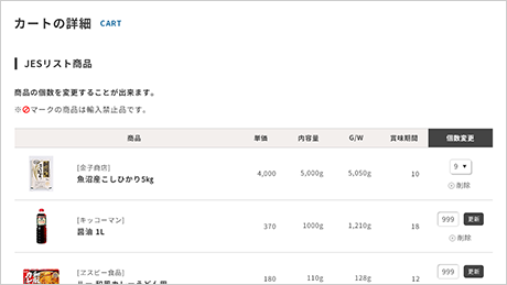 カートでは数量の変更、商品の削除、追加が可能です。
